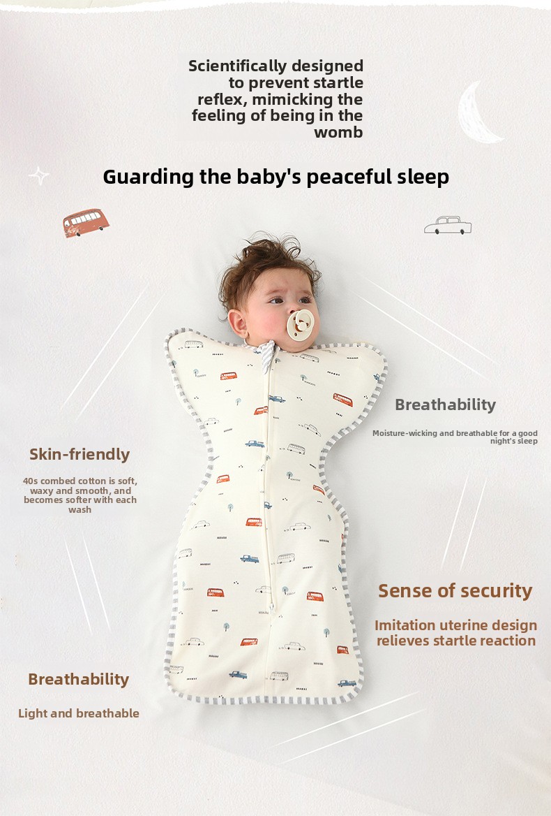 The snug wrap design gently reduces the Moro (startle) reflex, promoting longer, deeper, and more restful sleep. It recreates the secure feeling of being in the womb for added comfort and calm.